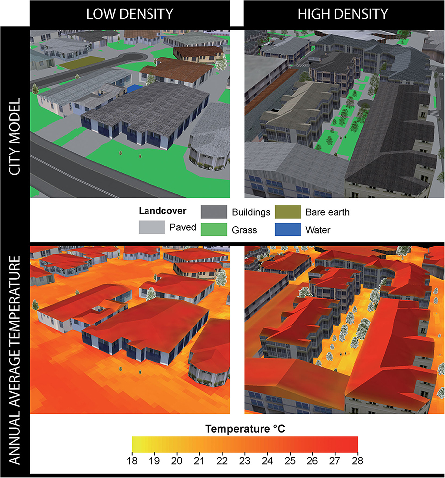 Three-dimensional city models (top row) and average annual mean radiant temperature (Tmrt) overlays (bottom row) for subsets of two SA1 locations representing low-density (cul-de-sac in Currambine) and high-density (infill site in Subiaco) developments.